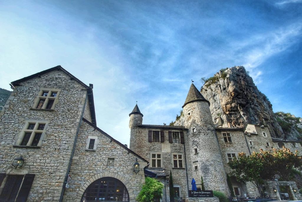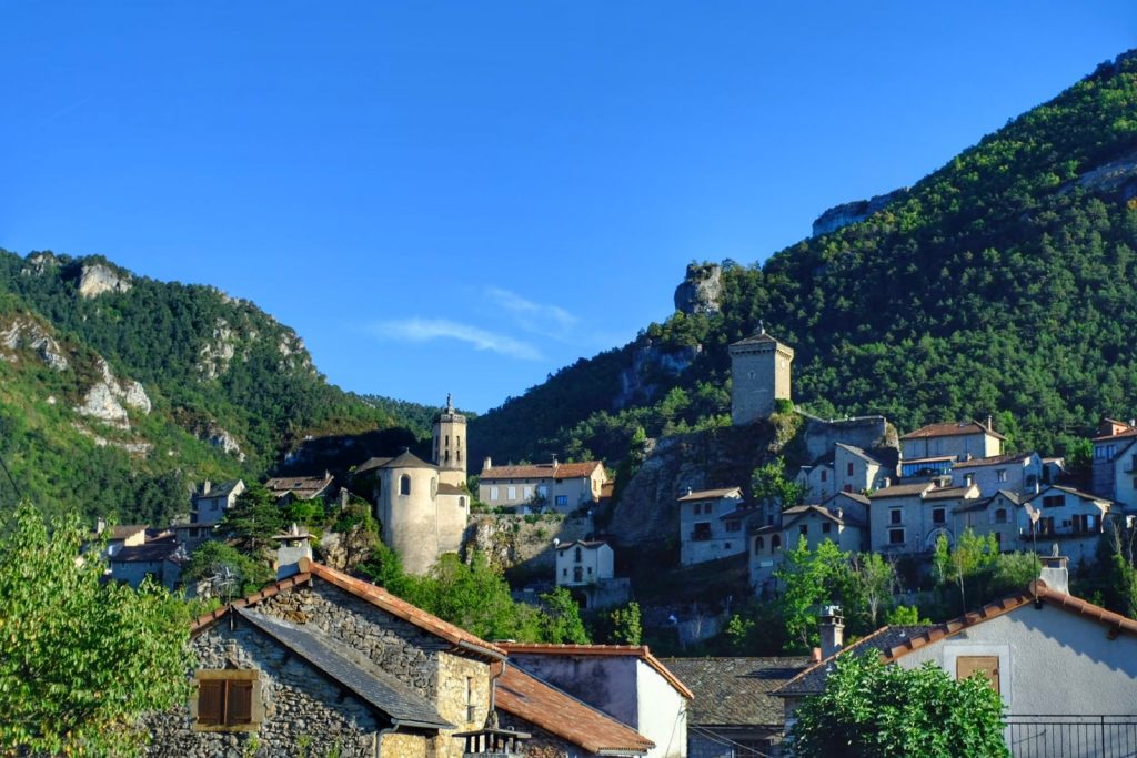 Este pequeño pueblo nos encantó y su cascada nos hechizó de tal manera que salimos rumbo a La Malène al atardecer, no sin antes hacer una pausa en el camino aparcando al costado de la carretera para ver un pueblo que parece de cuento: Hauterives de Tarn, un pueblo colgado sobre la ladera del Causse Méjean que además cuenta con un castillo del siglo XII. El pueblo, que ostenta el título de Plus Beaux Villages de France, es tan escarpado como aislado, ya que solo es accesible en barca.