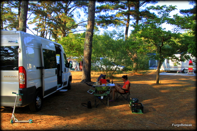 Baina prezioaz hitz egin dezagun… Les Pins Bleus kanpina udal-kanpina da, horregatik, prezioak ohi baino merkeagoak dira: 14€/ 2 heldu eta haur bat, furgoneta eta argindarra.Honek autokarabana-guneraren aukera(10€/gaua) zuzenean baztertzera garamatza.