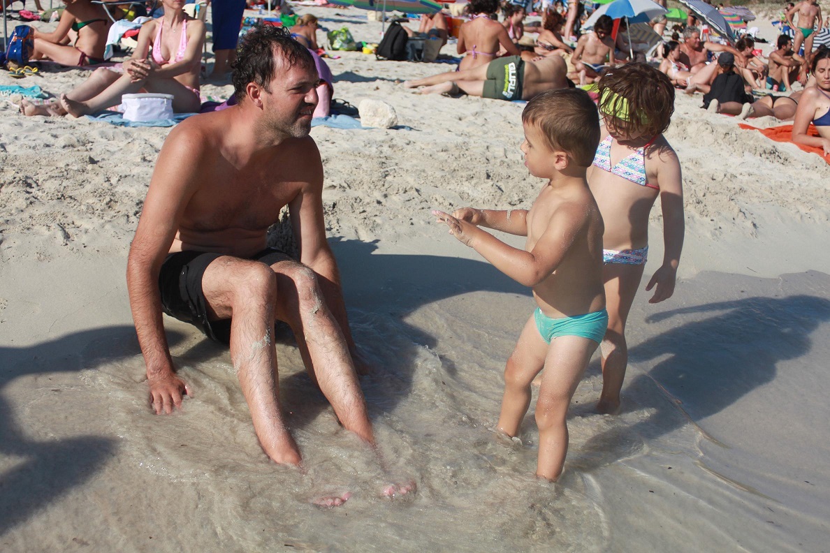 Regreso a la furgo, desayunamos los tres y bajamos a la cala a pasar la mañana. Para las 10 AM la playa está llena, y las sombrillas colonizan cada cm de arena. El no va más llega cuando uno de esos barcos rojos «Fiesta» llega y suelta en la playa no sé cuantas sombrillas más…