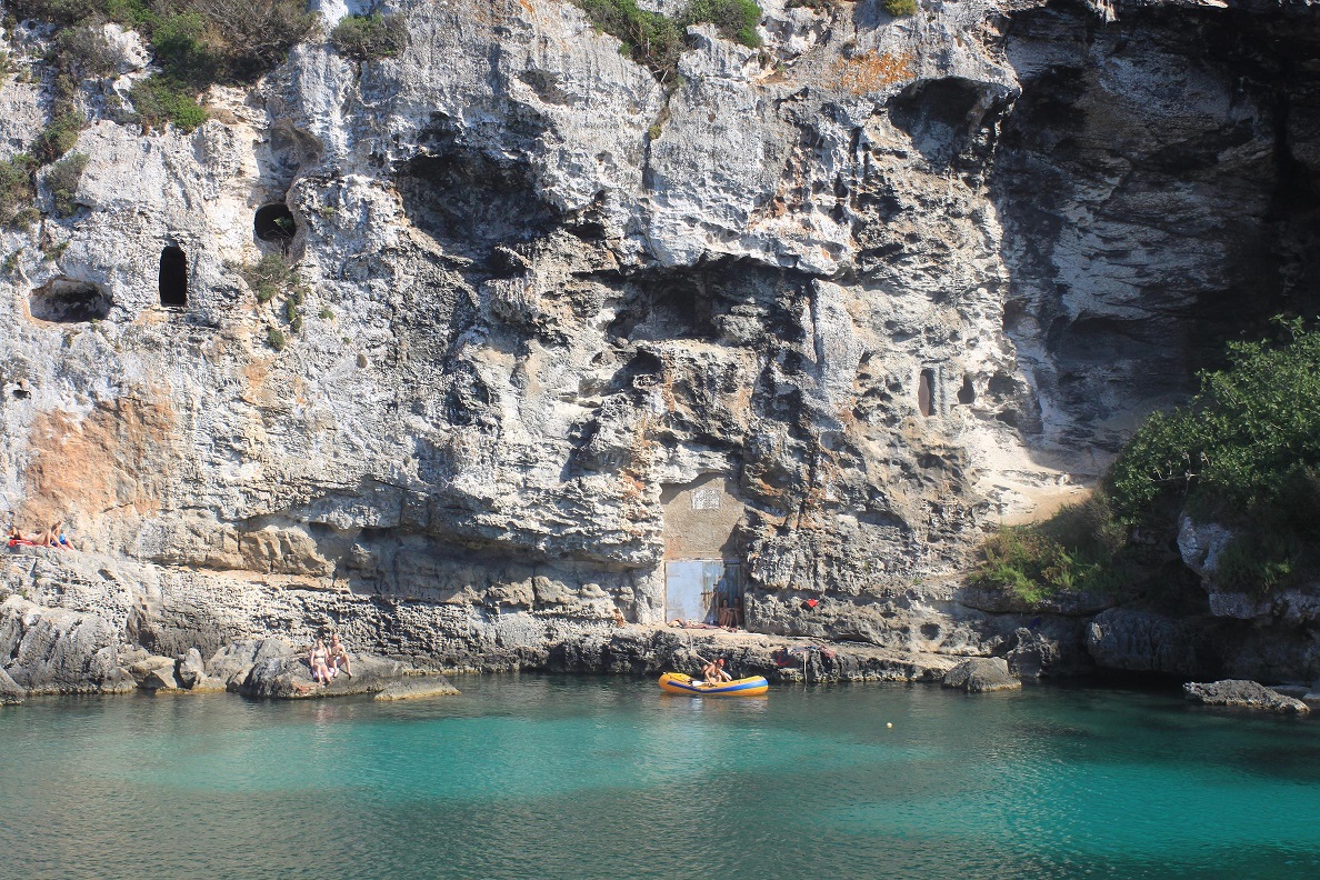 Está rodeada de acantilados altos y verticales, en los cuales encontramos casi un centenar de cuevas artificiales excabadas en la roca (la mayor agrupación en toda Menorca.